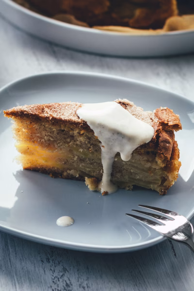 Noch lauwarm oder etwas aufgewärmt (Mikrowelle) schmeckt dieser Kuchen besonders fein. Zum Servieren auf jedes Stück 1 Esslöffel Schmand oder Crème fraîche geben und mit etwas Zimtzucker bestreuen.